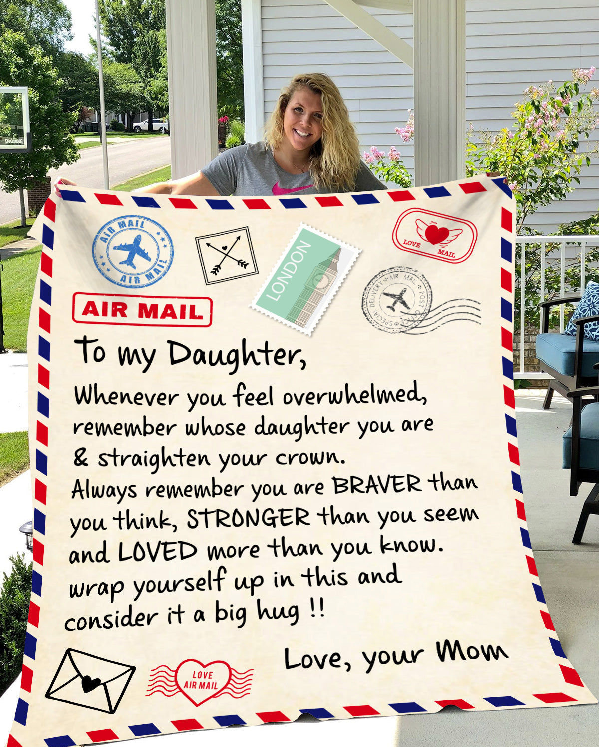 To My Daughter, Whenever you feel overwhelmed, remember whose daughter you are & straighten your crown. Always remember you are BRAVER than you think, STRONGER than you seem and LOVED more than you know. Wrap yourself up in this and consider it a big hug!!  Love, your Mom